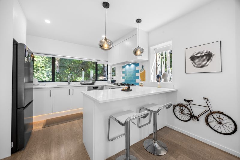 The fresh, light, and open interior of the handsome living area where the whole house is filled with sunlight, flows out to the entertainers covered and private deck, overlooking the manicured gardens, and the native bush with birdsong all year round. The contemporary kitchen features spacious and functional flow and will allow you feel the food and cook with absolute passion.