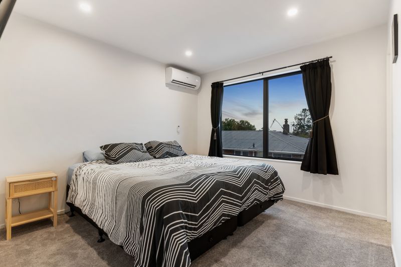 Inside, the thoughtfully designed layout features a spacious master suite complete with a walk-in wardrobe, private ensuite, and elevated views of the city and Sky Tower. Two additional sun-filled bedrooms provide plenty of space for family or guests, while heat pumps on both levels ensure year-round comfort throughout the home.
